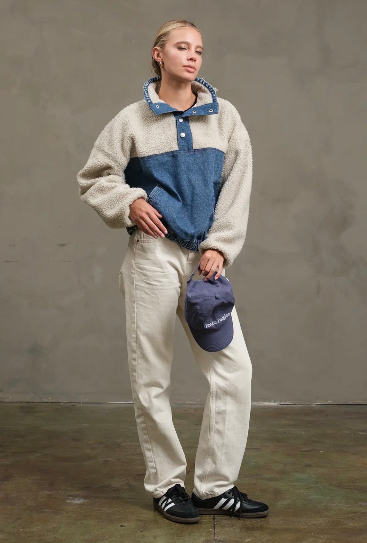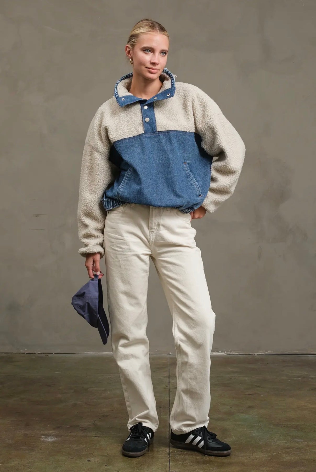Regular price $159.00A cozy pullover jacket featuring soft teddy fleece sleeves and top, contrasted with mid wash denim body. Perfect for laying on chilly days.