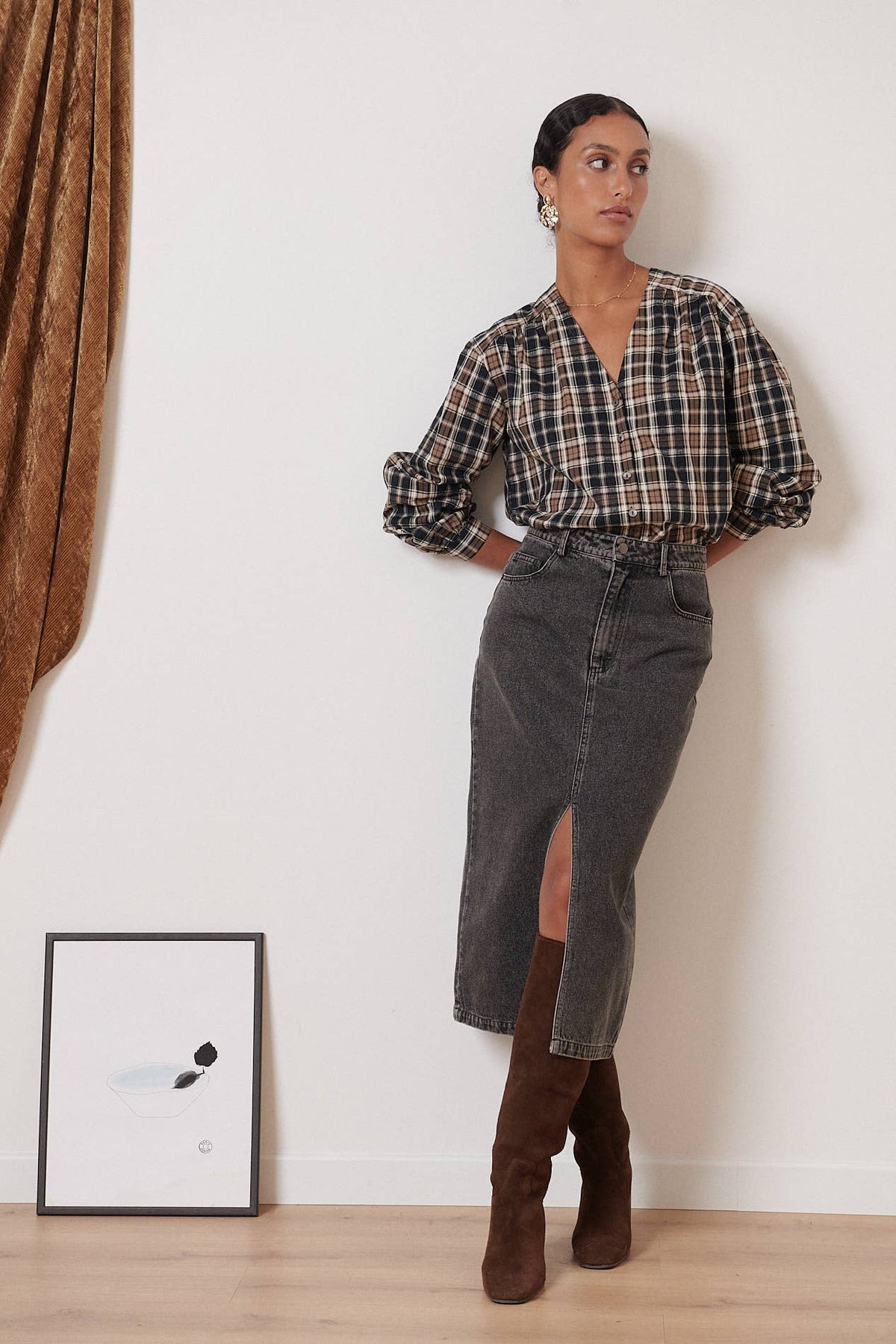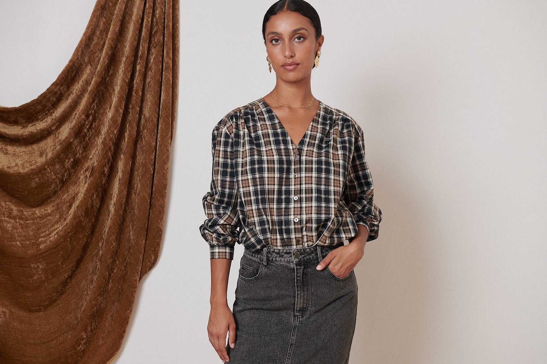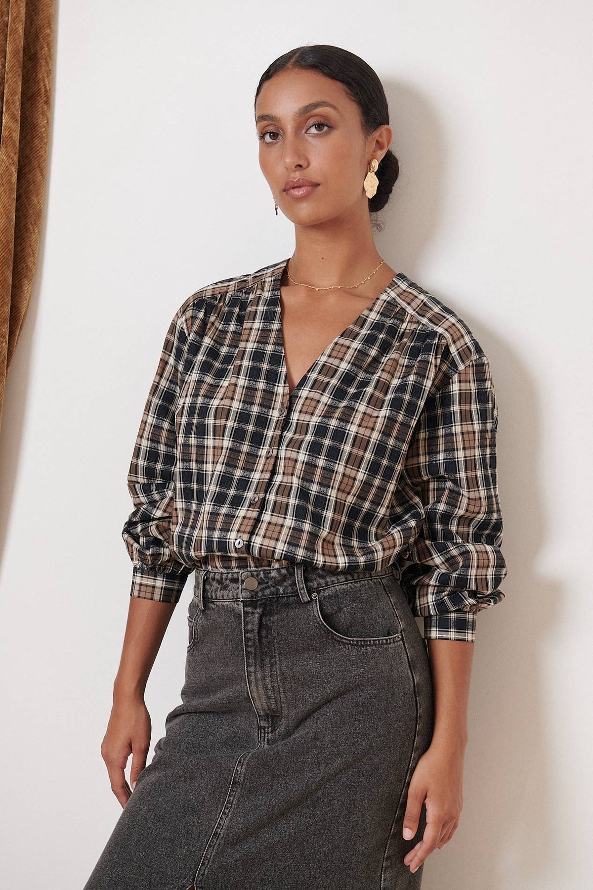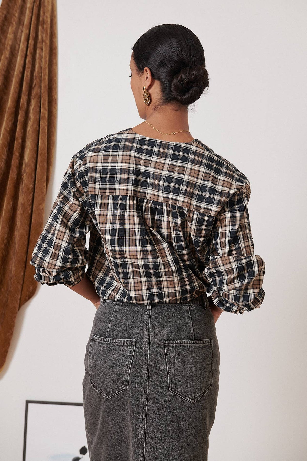 The Sevilla Checkered Blouse boasts a classic plaid pattern, elevated by stylish cut-outs and gathers along the V-neckline. With long sleeves and pearly buttons, this blouse offers both sophistication and comfort. Perfect for a polished and trendy look.